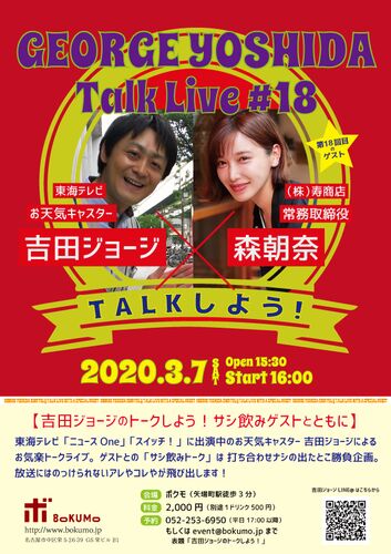 追記(2020.3.2):3/7(土)にボクモにて開催予定でした「吉田ジョージのトークしよう!サシ飲みゲストとともに」。ボクモとの協議の結果、昨今の状況を鑑みて、期日未定の延期とさせて頂きます。森朝奈さんを迎えて次回の開催日決まれば、今回ご予約頂いた皆様…